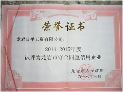 我司獲得2014-2015年度龍巖市守合同重信用企業(yè)榮譽(yù)稱號(hào) 2016年3月,市政府按照“守合同重信用”企業(yè)標(biāo)準(zhǔn),根據(jù)企業(yè)生產(chǎn)經(jīng)營的簽訂合同,履行合同,誠實(shí)守信,為推動(dòng)社會(huì)誠信建設(shè)發(fā)揮了積極作用等情況,以龍政綜 [2015] 387號(hào)文,認(rèn)定本公司等全市233家企業(yè)為2014-2015年度龍巖市守合同重信用企業(yè),并希望被認(rèn)定的企業(yè)珍惜榮譽(yù),再接再厲,為推動(dòng)我市社會(huì)信用體系建設(shè),進(jìn)一步營造誠實(shí)守信的市場環(huán)境作出新的更大貢獻(xiàn)。
